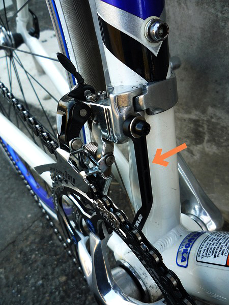 矢印の黒いパーツね。内側にチェーンが落ちるのをガードいたしやす。