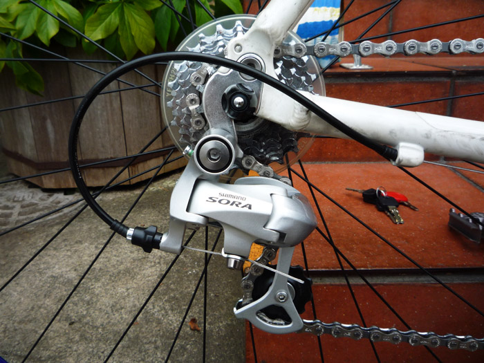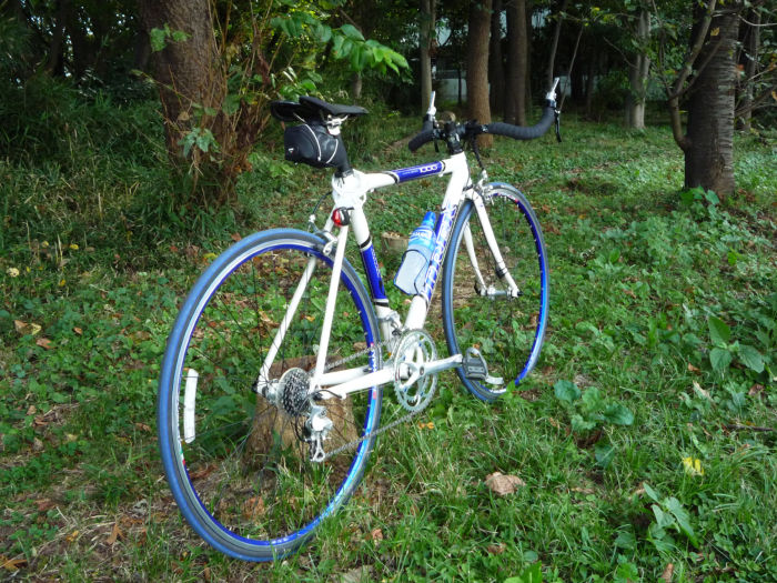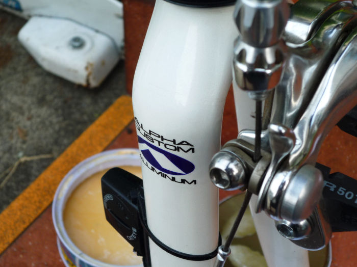 自転車引っ張り出してみると、ちょっと汚いね。油汚れの手でベタベタとフレームを触るもんだから、白いフレームに黒い指紋がついてたりしてる。