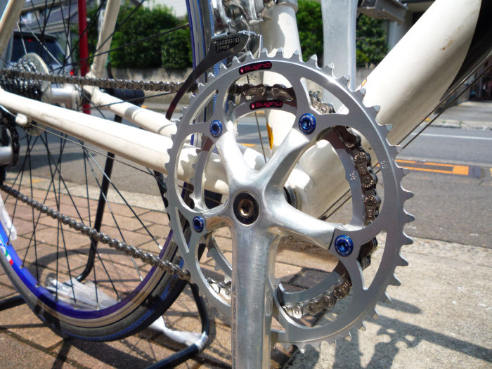 勢いで、インナーは38Tにしといた。リング固定ボルト&ナットを青くしてみたがどうなんだこれは。