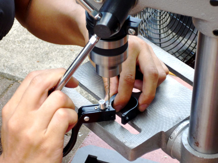 ブレーキレバーのクランプにシフトワイヤーを通す穴を開けてしまおうという魂胆。