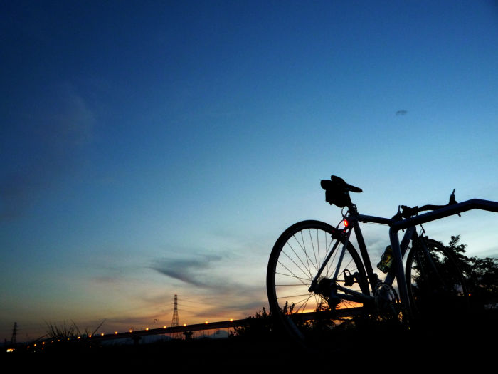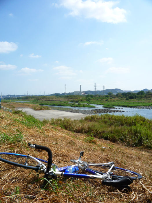 あきらめてチンタラと河原を走っていると、謎の青年(ママチャリ+スーツ姿)に遭遇。