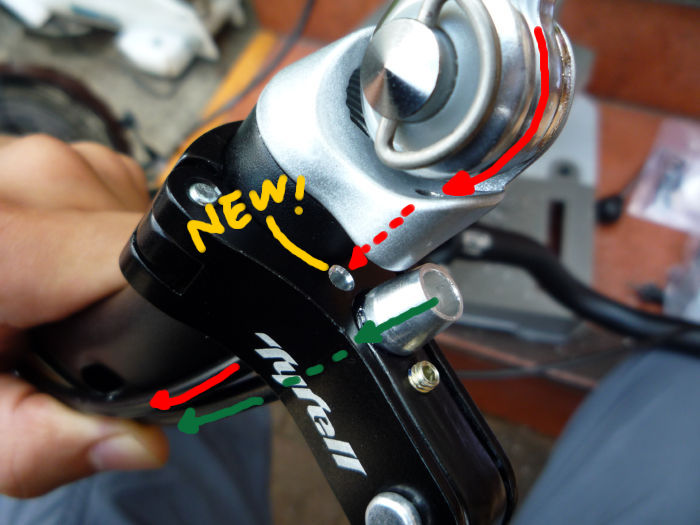 こんなかんじ。黄色のNEW!が開けた穴。赤線がシフトワイヤーで緑線がブレーキワイヤー。
